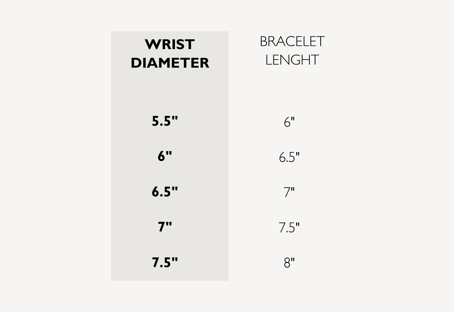 Use a soft measuring tape or string to measure your wrist and refer to this chart to determine the appropriate bracelet length.
