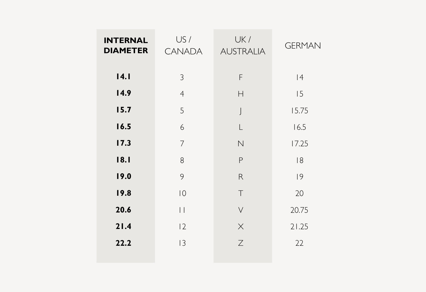 Select an existing ring that fits the desired finger. Measure the internal diameter of the ring (in mm). Use this chart to determine your ring size.
