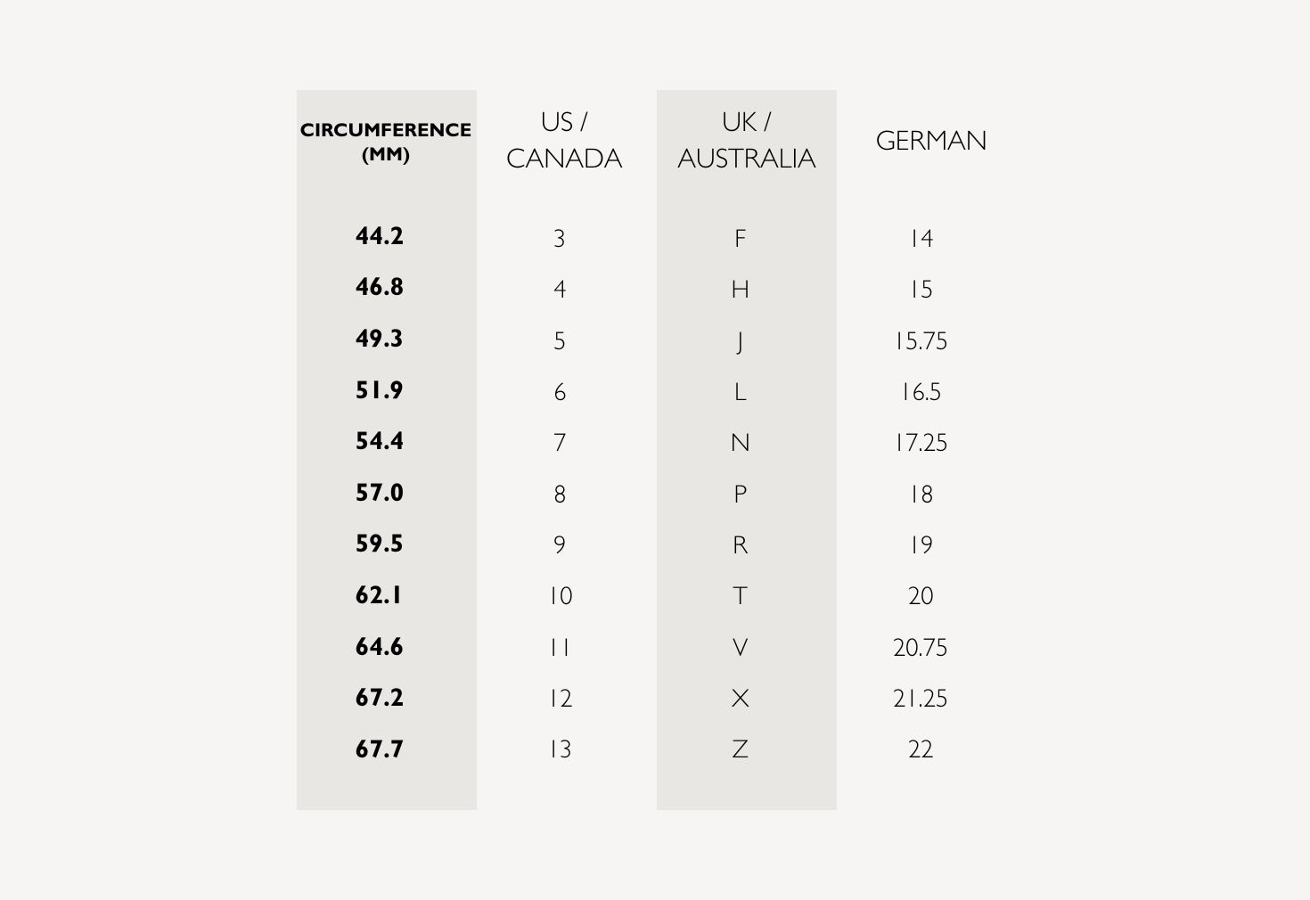 Wrap a strip of paper around your the finger where you’d like your ring to be. Make sure that the paper is pulled snug to your finger, the tighter the better, to find your best fit. Mark the spot where the paper meets and measure the distance with a ruler (mm). Use this chart to determine your ring size.